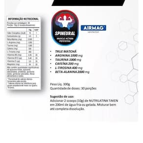 O pré-treino taken nutrilatina é o pré-treino com exclusivo dispositivo metabólico spineural para neuro ativação muscular com efeito limpador nos marcadores inflamatórios dos músculos. Reduz a sensação de cansaço e stress físico para a rápida ativação energética e estimulação nos treinamentos de força e resistência física. - 200mg de cafeína - 400mg de l-tirosina - 2000mg de beta-alanina - 1000mg de arginina - 1000mg de taurina - matchá - spineural - airmag
