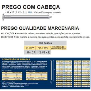 Prego com cabeça 19x27 - [2.1/2x9] - caixas/fôrmas para concreto Descrição: ????O Prego com cabeça possui corpo liso, cabeça cônica e axadrezada e ponta tipo diamante. Aplicações: Construção de todos os tipos; Confecção de estruturas temporárias; Construções Pesadas; Marcenaria; Embalagens; Caixarias; Pontes; Mata-burros e Porteiras. Benefícios: Maior rendimento por quilo e Maior giro no Ponto-de-Venda. Dimensão (JP x LPP): 19 x 27. Dimensão (pol. x BWG): 2.1/2 x 9. Quantidade aproximada em 1kg: 167. Conteúdo: Caixa com 20 pacotes de 1 kg cada.