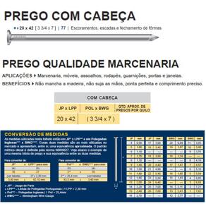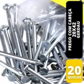 Prego com cabeça 20x42 - [3.3/4x7] - escoramentos, escadas e fechamento de fôrmas Descrição: ????O Prego com cabeça possui corpo liso, cabeça cônica e axadrezada e ponta tipo diamante. Aplicações: Construção de todos os tipos; Confecção de estruturas temporárias; Construções Pesadas; Marcenaria; Embalagens; Caixarias; Pontes; Mata-burros e Porteiras. Benefícios: Maior rendimento por quilo e Maior giro no Ponto-de-Venda. Dimensão (JP x LPP): 20 x 42. Dimensão (pol. x BWG): 3.3/4 x 7. Quantidade aproximada em 1kg: 81. Conteúdo: Caixa com 20 pacotes de 1 kg cada.