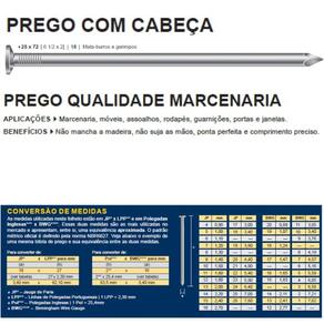 Prego com cabeça 25x72 - [6.1/2x2] - mata burros e garimpos Descrição: ????O Prego com cabeça possui corpo liso, cabeça cônica e axadrezada e ponta tipo diamante. Aplicações: Construção de todos os tipos; Confecção de estruturas temporárias; Construções Pesadas; Marcenaria; Embalagens; Caixarias; Pontes; Mata-burros e Porteiras. Benefícios: Maior rendimento por quilo e Maior giro no Ponto-de-Venda. Dimensão (JP x LPP): 25 x 72. Dimensão (pol. x BWG): 6.1/2 x 2. Quantidade aproximada em 1kg: 19. Conteúdo: Caixa com 20 pacotes de 1 kg cada.