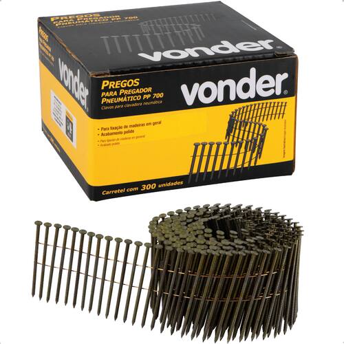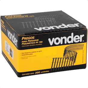 O Prego Anelado Vonder 70 mm PP700 Polido com 300 Peças é o parceiro ideal para quem busca eficiência em fixações profissionais de madeira. Desenvolvido especialmente para uso com o Pregador Pneumático PP 700 Vonder, esse prego garante alto desempenho em trabalhos intensos, com velocidade e segurança, seja em carpintarias, marcenarias, obras civis ou instalações industriais.
