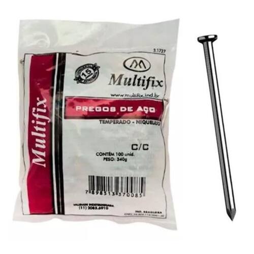 Detalhes do Produto Tipo de cabeça do prego - Chata Tipo de corpo do prego - Liso Tipo de ponta - Chata Marca - MULTIFIX Embalagem - 1 CENTO Quantidade - 100 Unidades Material - Aço Temperado