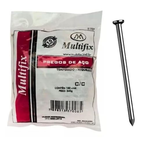 Detalhes do Produto Tipo de cabeça do prego - Chata Tipo de corpo do prego - Liso Tipo de ponta - Chata Marca - MULTIFIX Embalagem - 1 CENTO Quantidade - 100 Unidades Material - Aço Temperado Marca: Não Informado Ean: 7898513370078