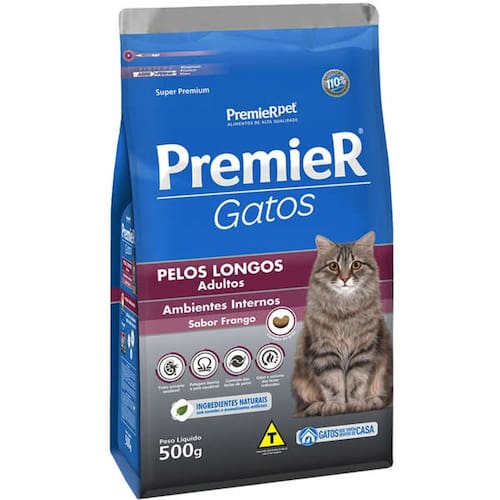 Racao Premier Ambientes Internos Gatos Pelos Longos Adulto Frango . 500g. Trato urinario saudavel: controle do pH urinario e minerais cientificamente balanceados;. Pelagem bonita e pele saudavel: com zinco e acidos graxos essenciais, omegas 3 e 6;. Controle das bolas de pelos: rico em fibras que auxiliam na sua eliminacao.