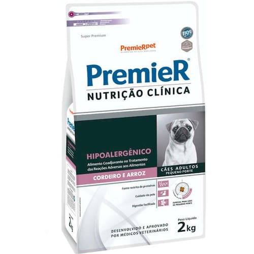 Ração Premier Nutrição Clinica Cães Hypoalergenico Cordeiro - 2kg- Fonte restrita de proteínas; - Altamente palatável, não contém glúten; - Feita com ingredientes de boa digestibilidade; - Auxilia no tratamento das reações adversas aos alimentos; - Promove cuidado com a pele, possuí níveis elevados de ácidos graxos ômega 3, ômega 6 e zinco; - Não indicado para filhotes, cadelas gestantes/lactantes e cães com alergia à proteína de cordeiro ou a qualquer outro ingrediente da composição.