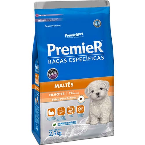 Ração Premier Cães Filhotes Raças Maltês 2,5kg- Nutrição específica: formulado com peru, arroz e aveia para cães com sensibilidade digestivo; - Pelagem bonita e pele saudável através de ácidos graxos essenciais ômegas 3 e 6, biotina e zinco; - Saúde intestinal: através da combinação de ingredientes de alta digestibilidade, fibras especiais e prebióticos; - Desenvolvimento excelente: níveis ótimos de proteínas, vitaminas e minerais. Enriquecido com DHA, ômega 3 essencial aos filhotes.