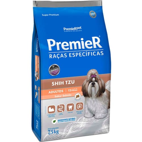 Ração Premier Raças Shih Tzu Adultos Salmão 7,5kg- Odor e volume das fezes reduzidos; - Pelagem bonita e pele saudável através de ácidos graxos essenciais ômegas 3 e 6, biotina e zinco; - Nutrição específica: formato especial do grão que facilita a preensão por cães braquicefálicos; - Saúde intestinal: através da combinação de ingredientes de alta digestibilidade, fibras especiais e prebióticos; - Saúde oral: contém hexametafosfato de sódio, importante ingrediente para a prevenção da formação do cálculo dental.