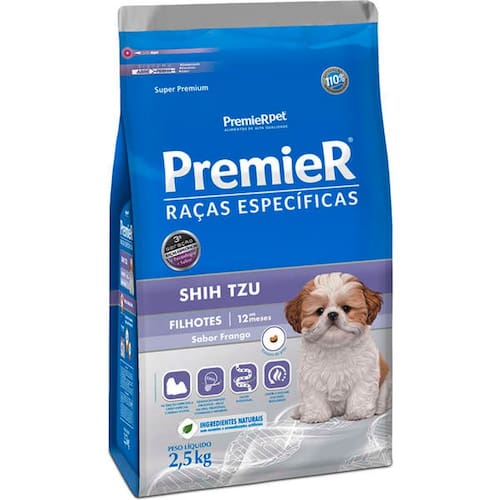 Ração Premier Cães Filhotes Raças Shih Tzu 2,5kg- Nutrição específica: formato especial do grão que facilita a preensão por cães braquicefálicos; - Pelagem bonita e pele saudável através de ácidos graxos essenciais ômegas 3 e 6, biotina e zinco; - Saúde intestinal: através da combinação de ingredientes de alta digestibilidade, fibras especiais e prebióticos; - Desenvolvimento excelente: níveis ótimos de proteínas, vitaminas e minerais. Enriquecido com DHA, ômega 3 essencial aos filhotes.