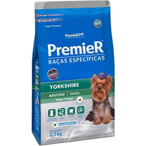 Ração Premier Cães Adultos Raças Yorkshire 2,5kg- Pelagem bonita e pele saudável através de ácidos graxos essenciais ômegas 3 e 6, biotina e zinco; - Nutrição específica: cuidado com o trato urinário, através de pH urinário cientificamente balanceado; - Saúde intestinal: através da combinação de ingredientes de alta digestibilidade, fibras especiais e prebióticos; - Saúde oral: contém hexametafosfato de sódio, importante ingrediente para a prevenção da formação do cálculo dental.
