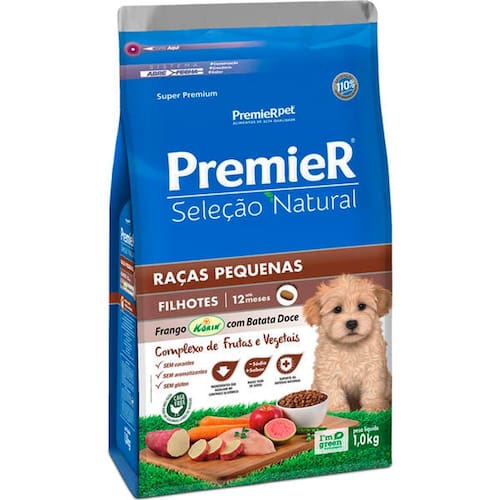 Ração Premier Cães Seleção Natural Filhotes Raças Pequenas Frango Com Batata Doce - 1kg - Baixo teor de sódio: preserva o sabor natural dos ingredientes; - Suporte às defesas naturais: associação de vitaminas e minerais; - Ingredientes que auxiliam no controle glicêmico: importante para uma vida saudável; - Complexo de frutas e vegetais: ingredientes selecionados como fontes naturais de fibras e sais minerais que nutrem de maneira saudável.