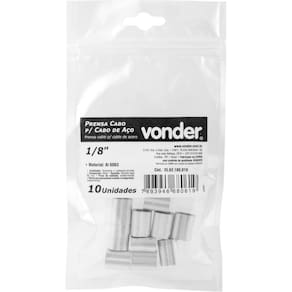 Marca: VonderConteúdo da embalagem: 1 Cartela com 10 peças.Destaques e diferenciais:Fabricado em liga de alumínio Al 6063 , que proporciona excelente resistência à corrosão/oxidação.Dicas de uso:Indicado para confecção de lingas de cabos de aço, substitui os grampos em configurações que dispensam desmontagens. É recomendado o uso de alicate especial para prensagem.Detalhes Técnicos:Material: Al 6063 Diâmetro interno: 3,97 mm Diâmetro do cabo indicado: 1/8 Ean: 7893946680619