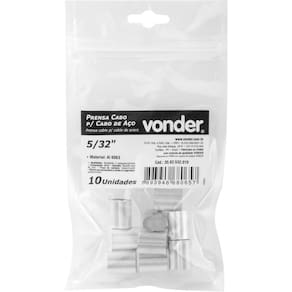 Marca: VonderConteúdo da embalagem: 1 Cartela com 10 peças.Destaques e diferenciais:Fabricado em liga de alumínio Al 6063 , que proporciona excelente resistência à corrosão/oxidação.Dicas de uso:Indicado para confecção de lingas de cabos de aço, substitui os grampos em configurações que dispensam desmontagens. É recomendado o uso de alicate especial para prensagem.Detalhes Técnicos:Material: Al 6063 Diâmetro interno: 4,76 mm Diâmetro do cabo indicado: 5/32