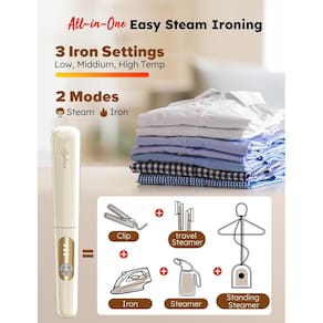 - FÁCIL DE PASSAR ROUPA EM UM: este ferro a vapor de viagem combina cozimento a vapor, passar a seco, pendurar, alisar e passar com braçadeira em um dispositivo compacto. Com três configurações de aquecimento ajustáveis, ele atende a diferentes tecidos com precisão. O layout intuitivo de três botões garante facilidade de uso para todos os níveis de habilidade. Não é necessária tábua de passar roupa — você pode passar a ferro confortavelmente em qualquer lugar, até mesmo no sofá, economizando tempo e espaço