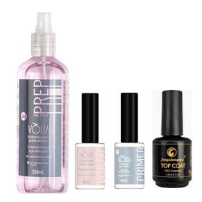 Kit preparação para unhas em gel volia contém: 1 - prep volia higienizante para unhas 350ml 1 - primer volia para unhas nail bonder 10ml 1 - desidrat volia para unhas com ação desengordurante 9ml 1 - top coat clear fengs