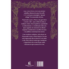 Uma coletânea dos melhores trabalhos clássicos do autor best-seller C. S. Lewis para contemplar o “grande milagre” da ressurreição de Jesus. Preparando-se para a Páscoa é um guia único – conciso e útil – para os fiéis de todas as tradições cristãs a fim de ajudá-los a aprofundar o conhecimento e a consideração sobre esta época sagrada: um momento de reflexão enquanto consideramos o sacrifício de Jesus e sua jubilosa ressurreição dos mortos. Com curadoria cuidadosa, cada seleção em Preparando-se para a Páscoa baseia-se em um tema importante dos escritos de Lewis sobre a vida cristã, além de outros que consideram a importância de ter uma fé que confia e descansa no que aconteceu na cruz.