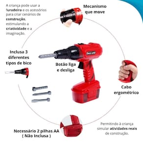 Características Design ergonômico e colorido que imita ferramentas reais Funcionamento à pilha com motor que gira de verdade Estimula criatividade, coordenação motora e raciocínio lógico Material durável e atóxico, garantindo segurança durante o uso Perfeito para introduzir noções básicas de construção e engenharia