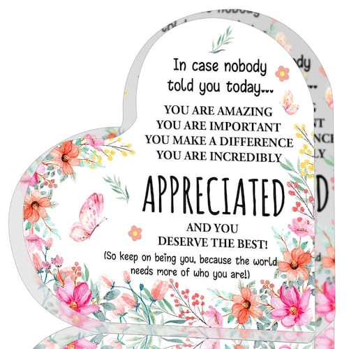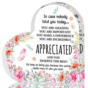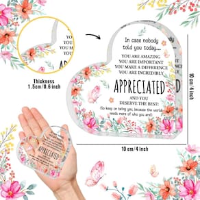 Celebre as mulheres notáveis em sua vida com esta requintada lembrança de coração de acrílico, meticulosamente trabalhada para incorporar elegância, inspiração e apreciação sincera. Projetada para ser um símbolo de gratidão e encorajamento, esta lembrança é um gesto atencioso para várias ocasiões, permitindo que você transmita seus sentimentos de maneira significativa e duradoura. - O que você recebe: você receberá com 1 peça de decoração acrílica em forma de coração, que é bem embalada para manter o produto em uma boa situação durante o transporte, você pode usar com confiança. Depois de receber o presente, a superfície está embaçada, retire a película protetora na superfície, a lateral da película é o lado da tela, espero que você goste - Tamanho notável: os presentes de alegria medem 10 x 10 x 1,4 cm/4 x 4 x 0,55 polegadas, o tamanho certo para colocar na sua mesa e fácil de ser notado por seus convidados, deixando uma impressão inesquecível neles - Linda decoração de casa/escritório: Esta placa de mesa acrílica resistente a quedas desempenhará um papel decorativo importante em várias ocasiões, como mesa de café, mesa de cabeceira, mesa de escritório, estante, lavatório e prateleira de parede... É um ornamento transparente, que pode ser facilmente combinado com livros, plantas, relógios, calendários e outras decorações. Ao contrário do vidro, ele não quebra se cair descuidadamente. - Presente de agradecimento: esta placa de agradecimento é o mais caloroso e melhor desejo para chefe, gerente, colega de trabalho, orientador, professor, professor, diretor, enfermeiro, terapeuta, instrutor, pastor, voluntário, melhor amiga, irmã, mãe. Presentes de agradecimento para colegas de trabalho, presentes de despedida para chefe, presentes de agradecimento para mulheres, que momento agradável quando ela recebe no dia de agradecimento do professor, semana das enfermeiras, dia do chefe, festa de aniversário, Natal ou Ação de Graças. - Design inspirador: o coração de acrílico transparente é adornado com palavras e designs motivacionais, tornando-o um presente atencioso e inspirador para colegas de trabalho, chefes e amigos.
