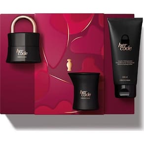 Presente feminino kit perfume her code o boticário Este kit contém: 01 her code eau de parfum 50ml 01 loção hidratante corporal her code 200ml 01 vela de massagem óleo corporal her code 90g O kit presente dia dos namorados her code vem com dois itens de perfumação e hidratação, além de uma vela de massagem em óleo corporal dessa enigmática linha. Os três itens vêm guardados em uma caixa de presente especial. Um presente dia dos namorados para namorada mais que especial: Eau de parfum Her code eau de parfum traz o acorde olfativo código secreto: único e instigante, uma combinação de ingredientes que despertam mistério. Um efeito licoroso e inebriante combinado à indulgência das frutas vermelhas, com a sofisticação do jasmim, envelopado com notas de sândalo. O frasco, em formato de cadeado, liberta o seu desejo e toda a sua sensualidade, com o ar do mistério e os códigos de sofisticação da linha. Vela de massagem óleo corporal A vela de massagem óleo corporal her code combina uma textura envolvente com a fragrância instigante e Sensual de her code, para estimular novas sensações. Benefícios: Hidratação imediata Textura delicada e confortável Sensação de relaxamento após massagem Sensação de pele macia e aveludada Pele perfumada Loção corporal Com o mesmo olfativo do eau de parfum, a loção hidratante corporal her code oferece mais que hidratação: a liberdade de se sentir bem na própria pele. Com o acorde olfativo código secreto, traz uma combinação de ingredientes únicos e instigantes que despertam mistério. Caixa para presente A caixa de presente vermelha demonstra todo o carinho que quem é apaixonado tem pra dar, destacando a simbologia do amor: corações vermelhos em diferentes formatos, demonstrando as várias formas de amar. Dimensões: 28x21x7 cm Marca: Não Informado