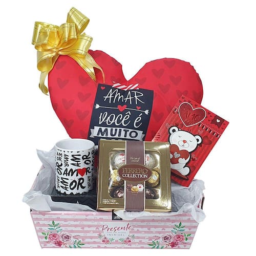 PRESENTE DE AMOR - PARA DIA DOS NAMORADOS - KIT DE CESTA COM ALMOFADA, CANECA E CARTÃO + CHOCOLATE FERRERO ROCHER