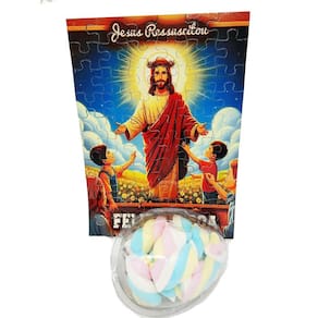 Quebra-cabeça Jesus Ressuscitado de 60 Peças: Além das delícias açucaradas, este presente inclui um quebra-cabeça encantador com 60 peças, trazendo à vida a alegria da Páscoa. Repleto de cores vivas e símbolos festivos, este quebra-cabeça é uma atividade cativante que estimula a mente e celebra o espírito da temporada.