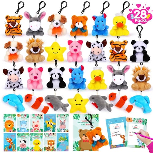 PACOTE DE SUPER VALOR. Nosso conjunto de brinquedos de pelúcia Animal Plush with Valentines inclui 28 peças de pelúcia fofa para animais e 28 peças de cartões contendo mensagens engraçadas e adoráveis que combinam com os brinquedos Plush Animals. - 🎁 PRESENTES DE DIA DOS NAMORADOS PERFEITOS PARA CRIANÇAS — O conjunto de brinquedos de pelúcia do Dia dos Namorados contém 28 lindos chaveiros de pelúcia e 28 cartões de Dia dos Namorados. Cada minibrinquedo tem uma aparência fofa e cores vibrantes, definitivamente conquiste os corações das crianças no Dia dos Namorados! E cada cartão de dia dos namorados impresso com palavras de amor engraçadas, ideal como cartões de troca de dia dos namorados para enviar bênçãos para seus entes queridos! - 🥳 INCRÍVEL LEMBRANCINHA DE FESTA DE DIA DOS NAMORADOS — Bichos de pelúcia para o Dia dos Namorados criados em 14 estilos, adoráveis personagens de animais, parecem vívidos e engraçados, devem ser um presente atraente na festa de Dia dos Namorados! Perfeito como lembrancinha de Dia dos Namorados para crianças, enche sacolas de presentes de Dia dos Namorados, prêmios de jogos, decoração de Dia dos Namorados, presentes de Dia dos Namorados para crianças, traz diversão e felicidade infinitas para sua família e amigos! - 💝 UMA SALA DE AULA IMPERDÍVEL PARA O DIA DOS NAMORADOS — Brinquedos de lembrancinhas de dia dos namorados causam impacto em sua classe e ajudam você a criar uma atmosfera romântica de Natal! Prepare 28 cartões de Dia dos Namorados cheios de votos de felicidades e chaveiro de bichos de pelúcia para dar a cada aluno, eles vão adorar essa surpresa! Ótimo para prêmios em sala de aula, material de sala de aula, presentes de Dia dos Namorados para crianças em sala de aula para mostrar seu carinho e amor! - 💌 JOYOUS DIY GIFTS TIME — Conjunto de chaveiros Pretty Valentines Toys, a melhor escolha para presentear seu filho com seu filho! Escreva o nome e as bênçãos nos grandes cartões de Dia dos Namorados e coloque o chaveiro de brinquedos de pelúcia correspondente no orifício do cartão. Um presente exclusivo de dia dos namorados está pronto! É bom trocar presentes em sala de aula para que as crianças expressem amor aos colegas, amigos e professores! - 🧸 LINDO ENFEITE DE CHAVEIRO — Bichos de pelúcia feitos de tecido premium e algodão PP, muito macios e seguros para o bebê tocar. Todos os brinquedos para animais com chaveiro na parte superior, que são delicados enfeites de Dia dos Namorados, pendurados na mochila, estojo de lápis, carteira, cartões ou caixas de presente, os tornam mais atraentes! Também é adequado para decorações de Dia dos Namorados para embelezar, adicione alguns elementos do Dia dos Namorados à sua casa!