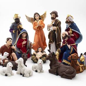 Presépio 2 Resina 14 Peças 15 cm Presépio, do latim Praesaepe, significa estrebaria ou curral. É um gesto que ajuda a preparar a celebração do nascimento de Jesus. Geralmente é formado pelo menino Jesus, Maria, José, os Reis Magos, o anjo, os pastores e os animais.Produto pintado a mão, podendo sofrer variações de cores.