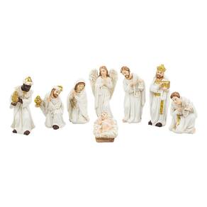 Enfeite decorativo no formato de presépio realista com vestimenta branca com 11 peças, sendo que a peça mais alta possui 7,5cm de altura.