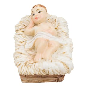 Presépio composto por: Menino Jesus não removível da manjedoura, Maria, José, pastor, os 3 magos Melquior, Baltazar e Gaspar, anjo, boi, ovelha e burro. Tamanhos proporcionais a peça mais alta.