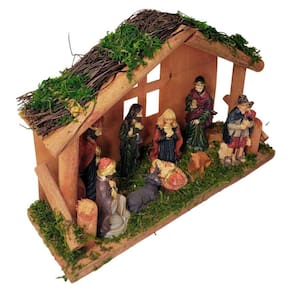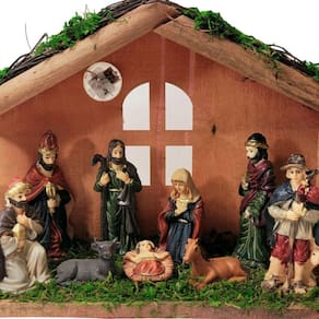 Com cerca de 20 centímetros de altura, o presépio apresenta a sagrada família: Maria, José e o menino Jesus. Maria está vestida com um manto azul delicado e um véu suave que cai sobre seus ombros. José, ao lado dela, usa uma túnica e segura um cajado de pastor. O menino Jesus repousa em uma manjedoura, com um olhar tranquilo em seu rosto.