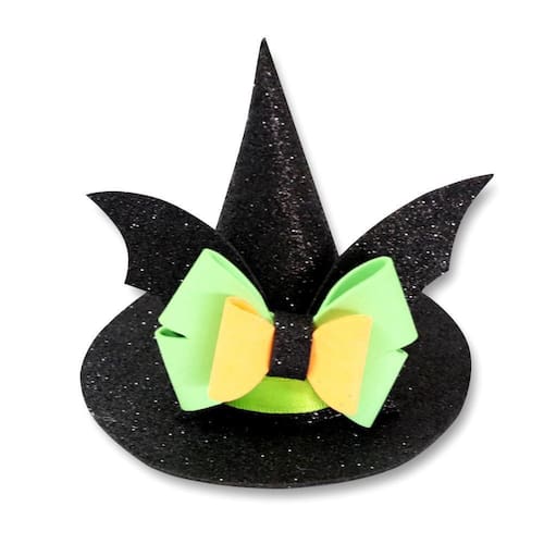 Transforme-se em uma feiticeira moderna e encantadora com a presilha chapéu de bruxa com morcego. Garanta já o seu acessório e encante a todos com seu estilo único e misterioso.
