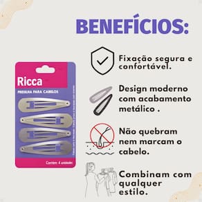 Presilhas Para Cabelos Belliz Ricca Tic Tac Metallic Blonde Cód. 1765 As Presilhas Para Cabelos Belliz Ricca Tic Tac Metallic Blonde Cód. 1765 unem estilo e praticidade em um único acessório. Com acabamento metálico em tom blonde, elas garantem um visual moderno e sofisticado, perfeito para compor penteados elegantes ou para o uso diário. Fabricadas com materiais resistentes e design anatômico, proporcionam firmeza sem marcar ou danificar os fios, sendo ideais para todos os tipos de cabelo.