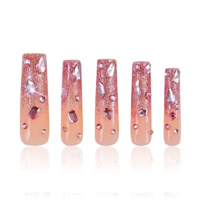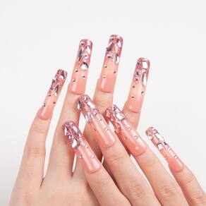 Pressione as unhas LOVFUL Pink Glitter com cristais de comprimento médio