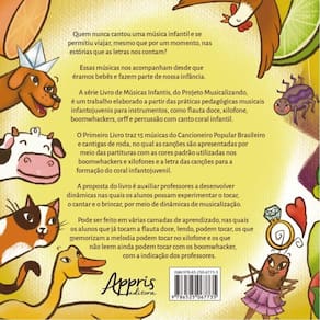 Quem nunca cantou uma música infantil e se permitiu viajar, mesmo que por um momento, nas estórias que as letras nos contam? Essas músicas nos acompanham desde que éramos bebês e fazem parte de nossa infância. A série Livro de Músicas Infantis, do Projeto Musicalizando, é um trabalho elaborado a partir das práticas pedagógicas musicais infantojuvenis para instrumentos, como flauta doce, xilofone, boomwhackers, orff e percussão com canto coral infantil. O Primeiro Livro traz 15 músicas do Cancioneiro Popular Brasileiro e cantigas de roda, no qual as canções são apresentadas por meio das partituras com as cores padrão utilizadas nos boomwhackers e xilofones e a letra das canções para a formação do coral infantojuvenil. A proposta do livro é auxiliar professores a desenvolver dinâmicas nas quais os alunos possam experimentar o tocar, o cantar e o brincar, por meio de dinâmicas de musicalização. Pode ser feito em várias camadas de aprendizado, nas quais os alunos que já tocam a flauta doce, lendo, podem tocar, os que memorizam a melodia podem tocar no xilofone e os que não leem ainda podem tocar com os boomwhacker, com a indicação dos professores. Marca: ARTERINHA EDITORA
