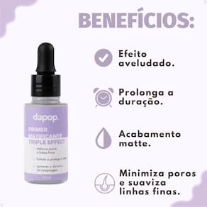 O Primer Matificante Dapop Triple Effect DP2261 da Dapop é a solução ideal para quem busca uma maquiagem impecável e duradoura. Com sua textura levinha e cobertura de efeito Matte, este primer prepara a pele, proporcionando um acabamento aveludado e minimizando imperfeições. Ele é perfeito para garantir que sua maquiagem permaneça intacta por mais tempo, enquanto cuida da sua pele.