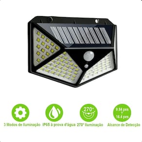 Características: Função 1: permanece desligada e acende sua luz máxima sempre que detectar movimento. Para ativar, aperte uma vez o botão de ligar. Função 2: permanece ligada em luz média de forma constante mesmo sem detectar movimento. Função 3: permanece ligada de forma constante em luz fraca mesmo sem detectar movimento, ao detectar movimento é ativada a luz forte. Material resistente: feita de abs, garante durabilidade e resistência às condições climáticas.