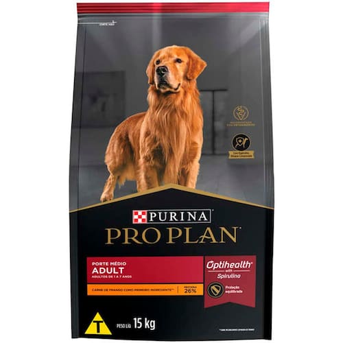 Ração pro Plan Cães Adultos Raças Médias- 15kg- Alimento para cães adultos; - Possui carne como 1º ingrediente; - Um alimento completo que reforça os sistemas naturais de proteção do seu cão e otimiza o funcionamento do trato digestivo. Marca: Não Informado