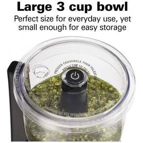 Mini processador de alimentos Hamilton Beach 72850, 350W, ideal para cortar, picar e triturar ingredientes. Possui tigela de 3 xícaras e design patenteado de pilha e prensa.Acessórios