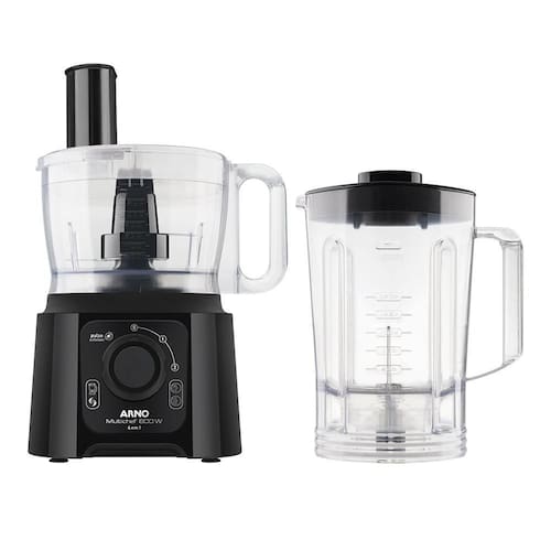 Processador de alimentos Arno Multichef 4 em 1 com funções de fatiar, ralar, picar e liquidificar. Possui 2 velocidades + pulsar, 600W de potência e sistema de segurança Secure Lock.Acessórios