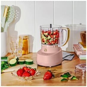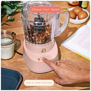 O mini processador de alimentos 3-Cup Food Chopper by Drew Barrymore, na cor rose, foi desenvolvido para preparo de pequenas porções em uso doméstico, com tigela de vidro de 3 xícaras adequada a receitas do dia a dia. O motor de 250W atua em conjunto com lâmina em aço inoxidável para picar, triturar e fazer purês de ingredientes como vegetais, ervas, nozes e bases de molhos.