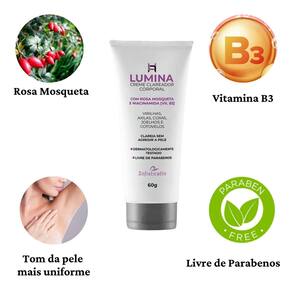 O Creme Corporal Lumina possui ingredientes cuidadosamente selecionados como a Rosa Mosqueta, que ajuda a clarear, regenerar e hidratar a pele, além de oferecer ação iluminadora e de antienvelhecimento. A Vitamina B3 presente na fórmula, também oferece ação antioxidante, hidratante, além de combater o envelhecimento precoce da pele.