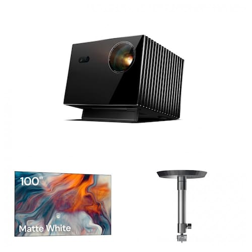 Recursos e tecnologias: Projetor com 3.500 lumens ISO, contraste dinâmico até 50.000:1, 110% Rec.2020, iris dinâmica, mapeamento de tom dinâmico, tecnologia Anti-RBE, relação de projeção 0,9–1,5:1, deslocamento de lente vertical ±105%, modos de baixa latência para jogos, Google TV, Wi-Fi 6E, rede gigabit, Dolby Atmos e DTS; tela fixa 100" com superfície matte branca ganho 1,3, PVC de alta qualidade, ângulo de meia-ganho de cerca de 170°, superfície tensionada, compatível com 4K/8K; suporte de teto em alumínio com capacidade até 10 kg, altura ajustável 31–40,5 cm (12 cm sem extensão), rotação 360°, inclinação de cerca de 20°, engate rápido e passagem interna de cabos