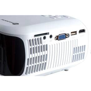 Foco manual;Caixa de som embutida;Conexão de áudio 3.5mm;Acompanha controle remoto;Proporção de tela: 4:3 / 16:9;Distância de projeção: 1,2 ~ 3,6m;Tamanho da projeção (diagonal): 35 ~ 120”;Lâmpada de LED com vida útil de até 25.000 horas;Interface de entrada: VGA, HDMI, AV, USB e Cartão SD.