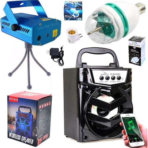 Kit iluminação projetor holográfico laser strobo + lampada giratória led bola maluca festa caixa som bluetooth celular -projetor holográfico canhão laserChave de funcionamento automático ou por música captado através de microfone embutido Controle de velocidade do motor e do strobo.Compacto e portátil ideal para festas, shows, buffet e apresentaões.Alimentado através de font bivolt 110/220v Possui cooler para refrigeraçãoMini tripé para apoio em superficies diversasControle de velocidade do stroboControle de velocidade do rotor internoMicrofone para captação no modo sound. -lâmpada de led colorido rotativaEfeito de iluminação cênica, efeito estroboscópicoBase de fabricação: e27 soquete de lâmpada comum Tipo: lâmpadasCor da luz: rgbPotência w : 3wTensão v : 110v / 220v bivolt automáticoVida útil estimada h : mais de 10.000 horasFonte de luz: led de alta performance Caixa de som bluetooth rádio fm mp3 portátilConectividade- ouça sua playlist através da entrada auxiliar, porta usb, cartão de memória ou pelo bluetooth. Rádio fm para sintonizar a sua estação preferidaPortabilidade- bateria recarregável com excelente autonomia. O melhor de seu som por muito mais tempo.Características:- som estéreo de alta qualidade- compatível com todos os dispositivos bluetooth- conexão bluetooth com smartphone, tablet, pc, notebook, etc- porta usb para pendrive- slot para cartão de memória- rádio fm integrado- ideal para o lazer, trabalho, estudos, academia, prática de esportes e muito mais- botões play, pause, avançar, voltar, menu e volume- chave liga / desliga- revestida em borracha- design e qualidade com o melhor custo x benefício- bateria de longa duração- todas as cores disponíveis em estoque conforme imagens do anúncio. Especificações técnicas:- alimentação: 5vdc via porta usb - frequência de resposta: 150 15000hz- impedância: 40 ohms- sensibilidade: 80db- distância de funcionamento: 10m máximo Atenção a cor da caixa de som é escolhida aleatoriamente, conforme a disponibilidade em estoque O kit contém: 1 projetor holográfico canhão laser 1 lampada rotativa color rgb 3w e27 led 1 caixa de som portátil 1 cabo usb 1 fonte de energia 1 mini tripé Homologação Anatel: 080281811799