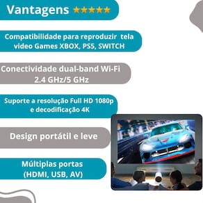 Principais perguntas sobre o produto e respostas: 1 consigo conectar vídeo game nele Sim, consegue usar como reprodução para vídeo games de todas as versões com saída hdmi. 2 consigo conectar hd externo Sim, basta plugar o hd na entrada usb. 3 conexa com celular Sim, via entrada usb. 4 posso conectar caixa de som Sim, apesar dele ter uma caixa de som embutida é possível conectar uma caixa de som pois o aparelho possuí saída p2. 5 vem com netflix instalada Sim, para logar é necessário entrar na conta google e logar a sua conta na netflix 6 consigo baixar outros aplicativos Sim, o projetor possui sistema android como um celular portanto é possível baixar programas na playstore. Homologação Anatel: 112572013224 Marca: Não Informado