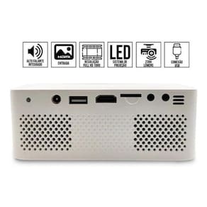 Este projetor possui brilho da imagem de 2300 lumens, garantindo imagens claras e vibrantes. O tamanho da imagem pode variar de 24'' a 120'', permitindo que você ajuste de acordo com suas necessidades. Além disso, possui diversas conexões de entrada, como HDMI, USB 2.0, Micro SD, Fone de 3.5mm, AV e DC.
