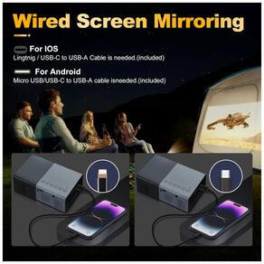 Suporta distâncias de projeção mínima de 1,3 m e máxima de 20 m, com montagem em mesa. Nota: devido a HDCP, espelhamento de apps protegidos requer TV Stick, Roku ou Chromecast via HDMI (adaptadores Lightning/Micro USB/Type-C não inclusos).