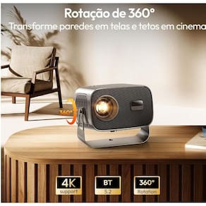 Correção trapezoidal e rotação 360: o mini projetor portatil com ajuste automático corrige a imagem em qualquer superfície e permite projeção em diferentes ângulos. Graças à rotação de 360, você pode posicionar o mini projetor portatil em mesas, tripés ou suportes sem perder qualidade.