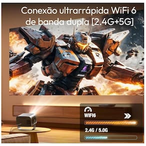 Conectividade avançada Wi-Fi 6 e Bluetooth 5.2: o mini projetor portatil com Wi-Fi 6 (5G/2.4G) garante transmissão estável, ideal para filmes e videochamadas, enquanto o mini projetor portatil Bluetooth conecta facilmente caixas de som, fones de ouvido e controles sem fio, oferecendo liberdade total de uso.
