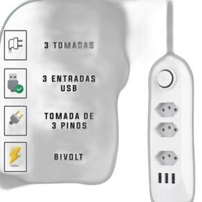 3 tomadas elétricas espaçadas para acomodar plugues grandes sem obstruções 3 entradas usb para carregar dispositivos móveis como smartphones e tablets Design compacto e leve, ideal para transporte e uso em diferentes ambientes Proteção contra surtos elétricos e sobrecargas, garantindo a segurança dos aparelhos conectados Compatível com redes elétricas 127v/220v, funcionando como bivolt automático Fusível de proteção integrado para evitar danos em caso de picos de energia Cabo de energia com comprimento ideal para facilitar o posicionamento