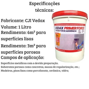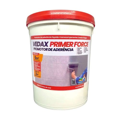 Promotor aderência vedax primer force 1kg tinta piso azulejo Vedax primer force - promotor de aderência e endurecedor de superfícies Alta resistência, aderência superior e versatilidade em um único produto. Vedax primer force é um promotor de aderência monocomponente que forma uma camada de alta resistência após a aplicação. Seu acabamento áspero favorece a aderência química e mecânica, sendo ideal para diversos substratos - desde superfícies lisas como porcelanatos e vidros, até bases porosas como concretos e rebocos deteriorados. Além disso, atua como endurecedor de superfícies, aumentando a resistência à abrasão e reduzindo o desgaste em pisos envelhecidos ou esfarelando. Principais vantagens: Cria ponte de aderência em substratos lisos e porosos Substitui o selador comum com desempenho superior Aceita assentamento direto de pisos cerâmicos e porcelanatos Melhora a coesão e resistência de rebocos e concretos Resistente à água estagnada Flexível: absorve pequenas fissuras em paredes externas Pode ser como primer para texturas e impermeabilizações Produto ecológico: sem solventes e com baixo voc Campos de aplicação: Concreto, reboco, argamassa e massa de regularização Pisos lisos: porcelanato, cerâmica, vidro Superfícies metálicas com preparo adequado Madeira e eps Chapisco rolado com agregado antes de gesso ou acabamento Paredes novas ou repinturas Lajes, terraços, coberturas, marquises e beirais Pisos deteriorados ou com baixa resistência soltando pó Modo de uso: Preparação da superfície: Deve estar seca, limpa, sem poeira, graxa, óleo ou nata de cimento. Trincas devem ser tratadas previamente com vedax sela trinca. Preparo do produto: Homogeneizar o produto com furadeira e hélice apropriada. Primeira demão: diluir com até 20% de água limpa Demais demãos: aplicar puro Ferramentas: rolo, trincha ou vassoura de cerdas macias Intervalo entre demãos: 2 a 3 horas Consumo médio: Substratos porosos: 300 a 500 g/m com diluição Substratos lisos: 150 a 300 g/m com diluição Superfícies metálicas: 150 a 300 g/m sem diluição Tempo de cura: 6 horas em reboco, concreto ou alvenaria 24 horas em pisos lisos como porcelanato e vidro Para assentamento de pisos: aguardar 72 horas após a última camada Indicado uso de argamassa tipo ac-iii e realização de juntas de dilatação Após o uso, lavar as ferramentas com água imediatamente. Produto seco só é removido mecanicamente. Restrições de uso: Não aplicar sobre superfícies úmidas ou sujeitas à umidade ascendente ou pressão negativa Embalagens disponíveis: 1 kg, 5 kg e 20 kg Validade: 24 meses armazenado fechado, em local seco e ventilado Composição: Água, resina elastomérica, cargas minerais e aditivos especiais Normas técnicas atendidas: Abnt nbr 13245 - execução de pinturas em edificações Abnt nbr 9575 - seleção e projeto de impermeabilização Vedax primer force: preparação inteligente, aderência reforçada, proteção duradoura. Ideal para quem exige resultados profissionais com segurança e praticidade.